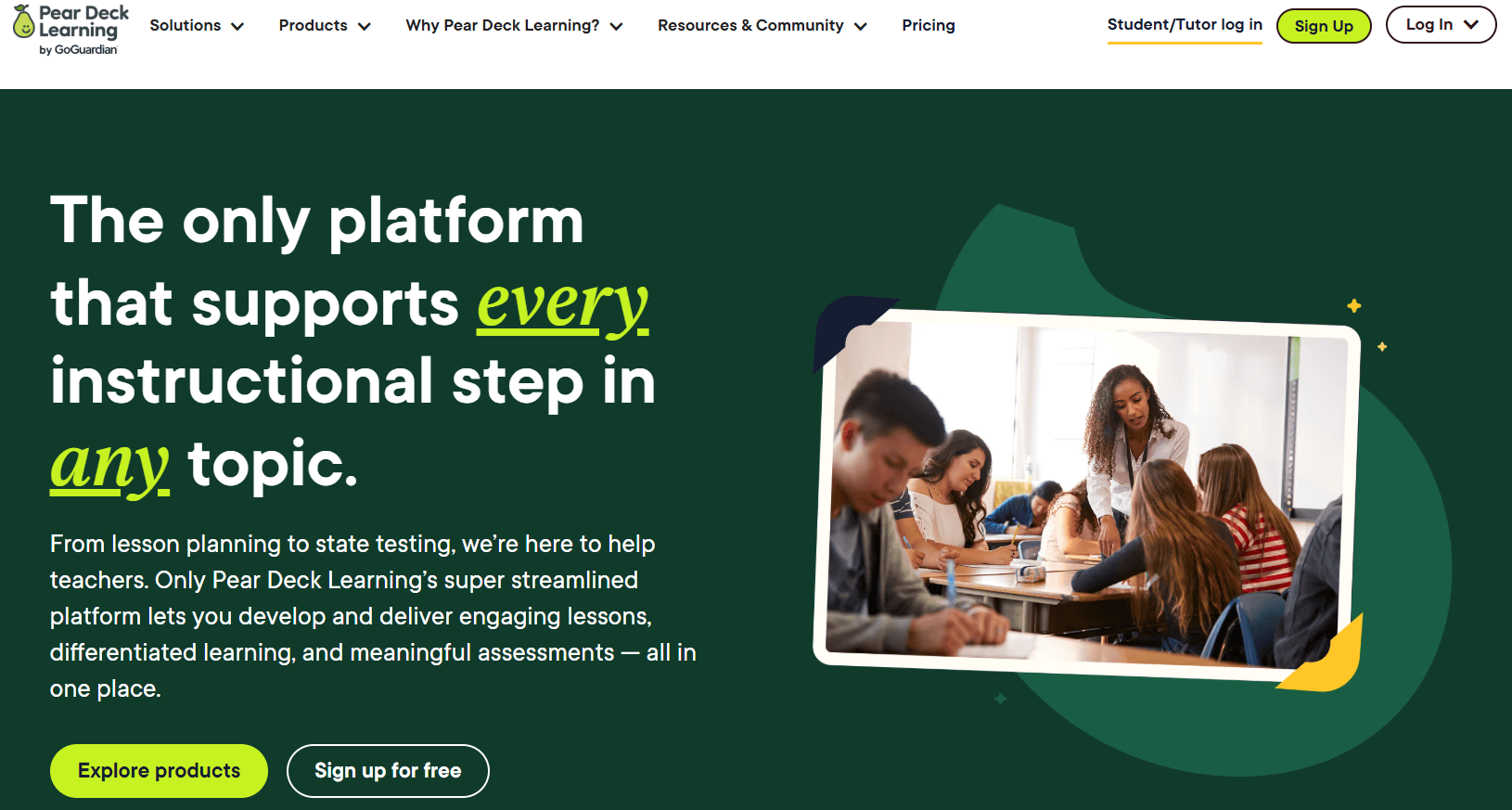 | Pear Deck | Interactive / Student Engagement / Presentation | Turns slides into interactive lessons. You can add questions, polls and checks for understanding. | Making slide lessons interactive. Keeping students involved during presentations. |